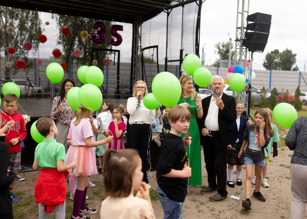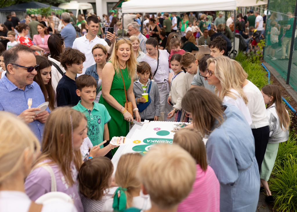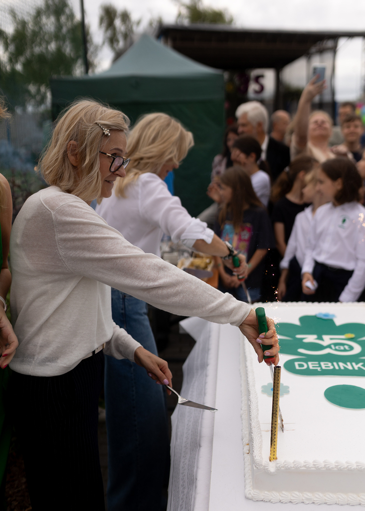 Pani Dyrektor Beata Łuczak-Wencel opowiedziała w formie krótkiej bajki historię powstania i rozwoju szkoły oraz podziękowała wszystkim, którzy ją na początku tworzyli i przez kolejne lata rozwijali; Pan Dyrektor Administracyjny Adam Grabus przypomniał jak zmieniała się i piękniała przestrzeń budynku i otoczenia przez 35 lat, Pani Wicedyrektor Justyna Kmiecik przeczytała wiersz jednej z uczennic o szkole, podkreślając przy tym, że tworzymy Dębinkę właśnie dla dzieci; Wiceprezes PSO Pan Leszek Ciesielski uroczyście otworzył jubileuszowy piknik, życząc Wszystkim wspaniałej zabawy.