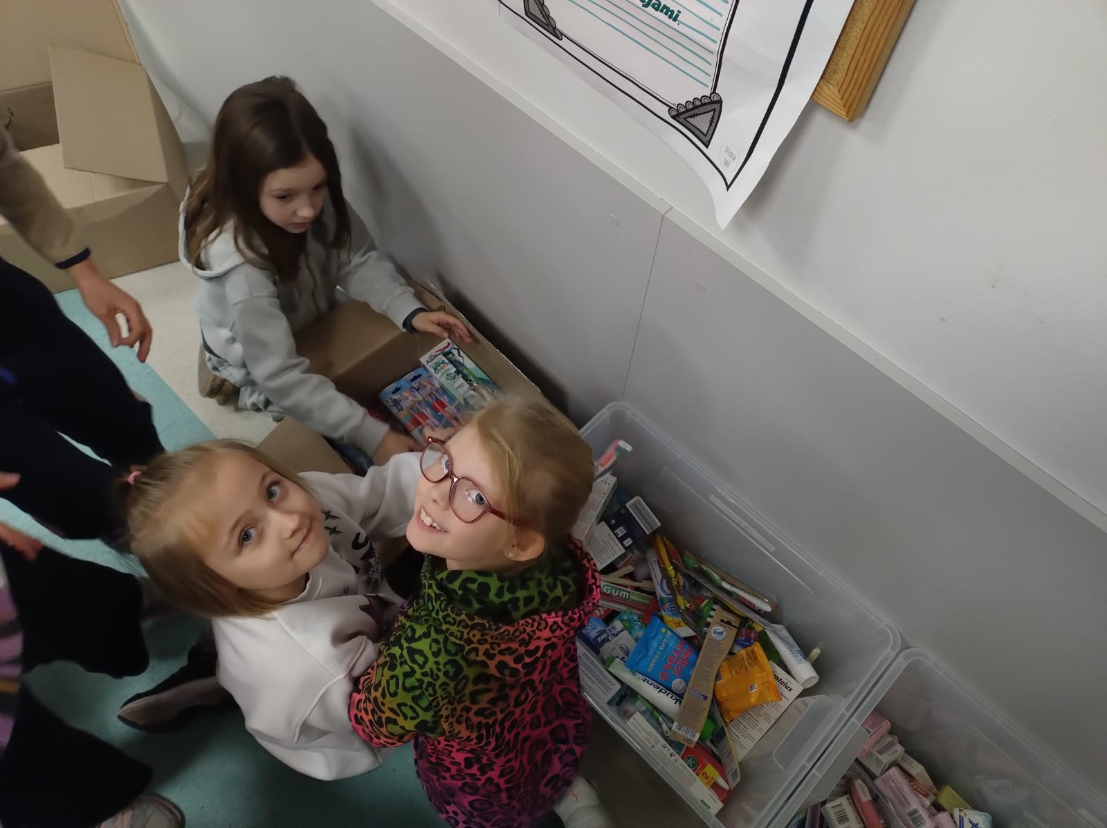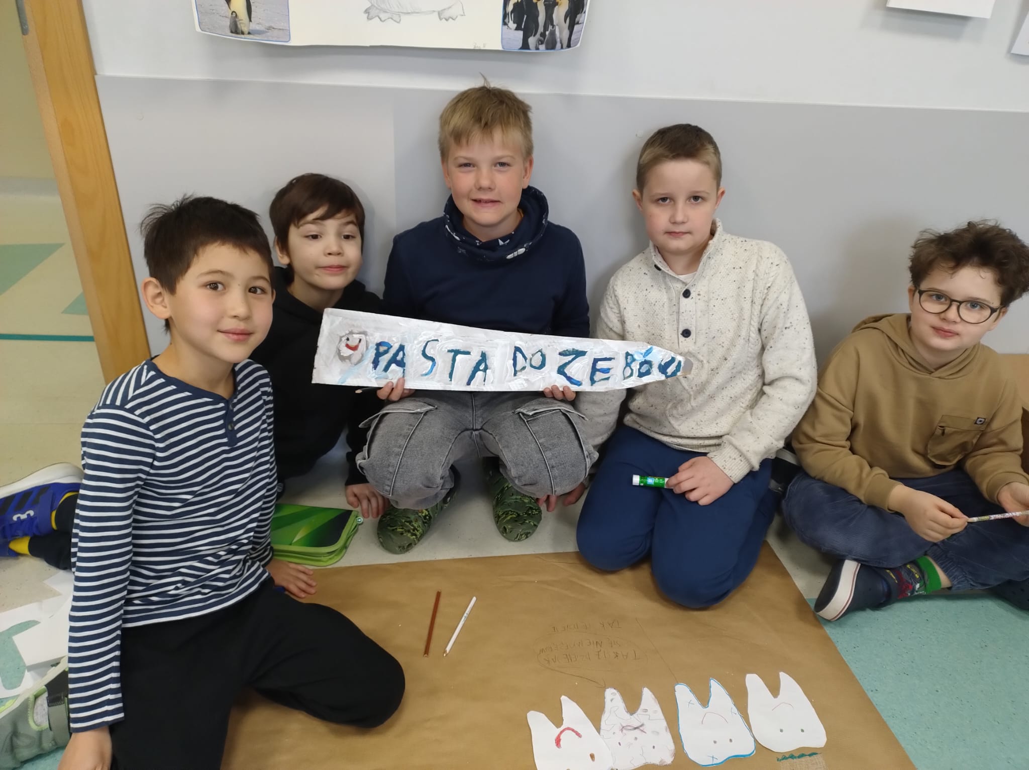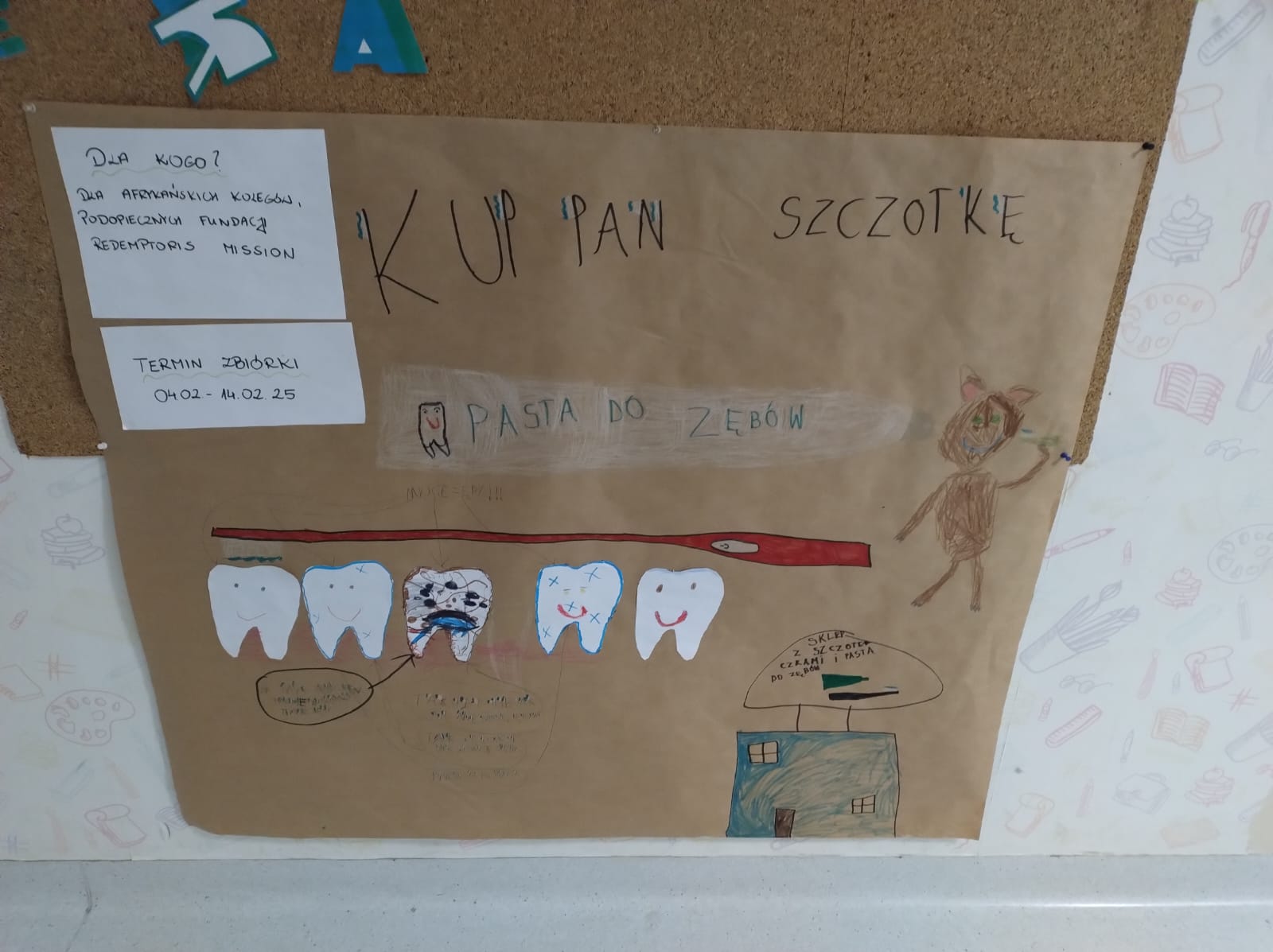 W dniach 04.02.-14.02.25 uczniowie klasy 2C zorganizowali zbiórkę past, szczoteczek i mydeł dla swoich afrykańskich kolegów- podopiecznych fundacji Redemptoris Missio. Wykonywali plakaty i kolorowanki, ozdabiali kartony, odwiedzali młodsze klasy, by w ramach spotkań zachęcać do wsparcia inicjatywy. Aby zwiększyć skuteczność swoich oddziaływań, rozdawali dyplomy „Ambasadorów Białego Uśmiechu”, wykonywali instruktaż mycia zębów, tworzyli elementy stomatologicznej scenografii. Udało się! Zebraliśmy 5 kartonów wypełnionych po brzegi potrzebnymi akcesoriami! Kłaniamy się więc nisko wszystkim, którzy włączyli się w naszą akcję i otworzyli swoje serca! Pamiętajmy – DOBRO wraca