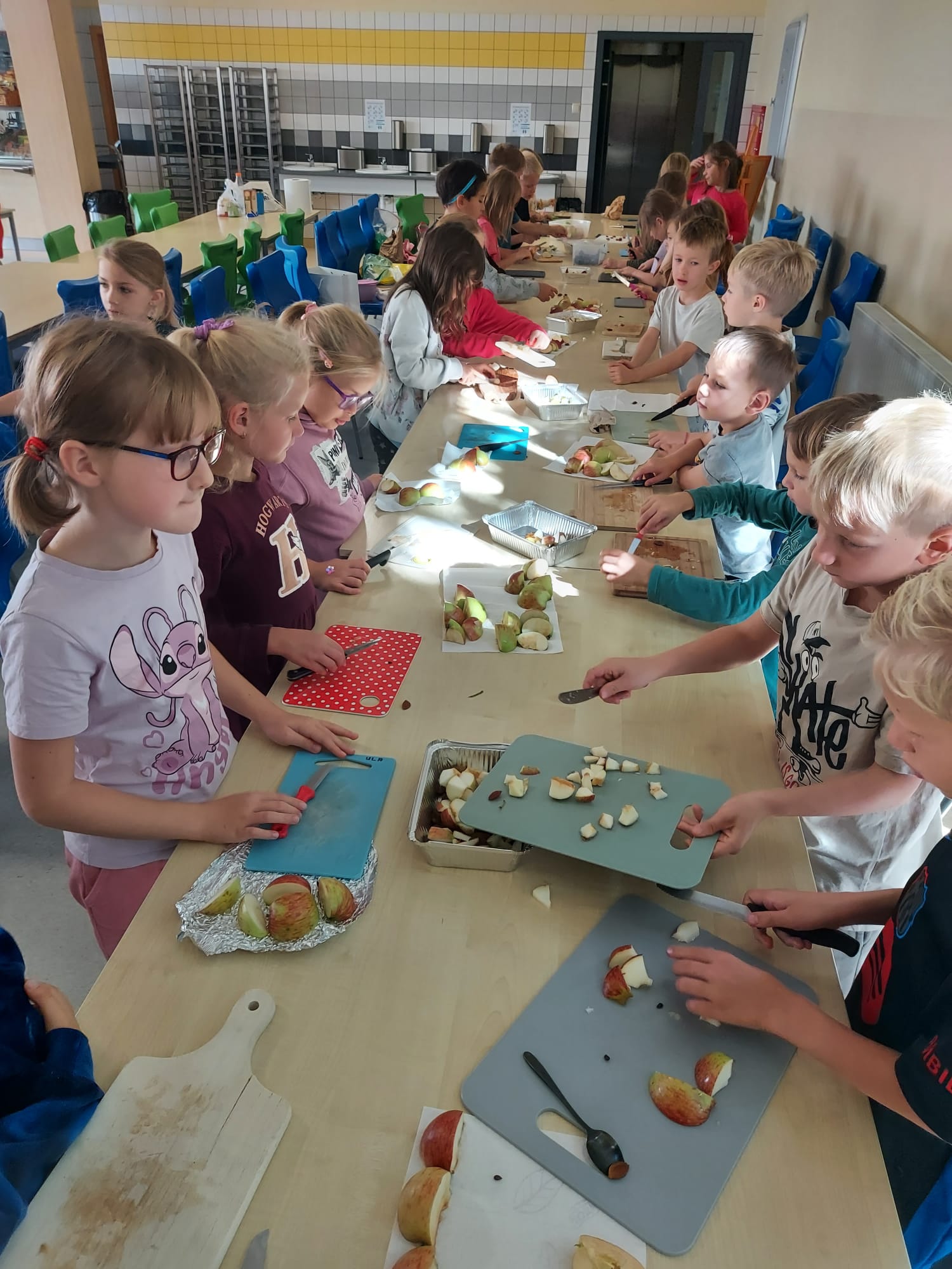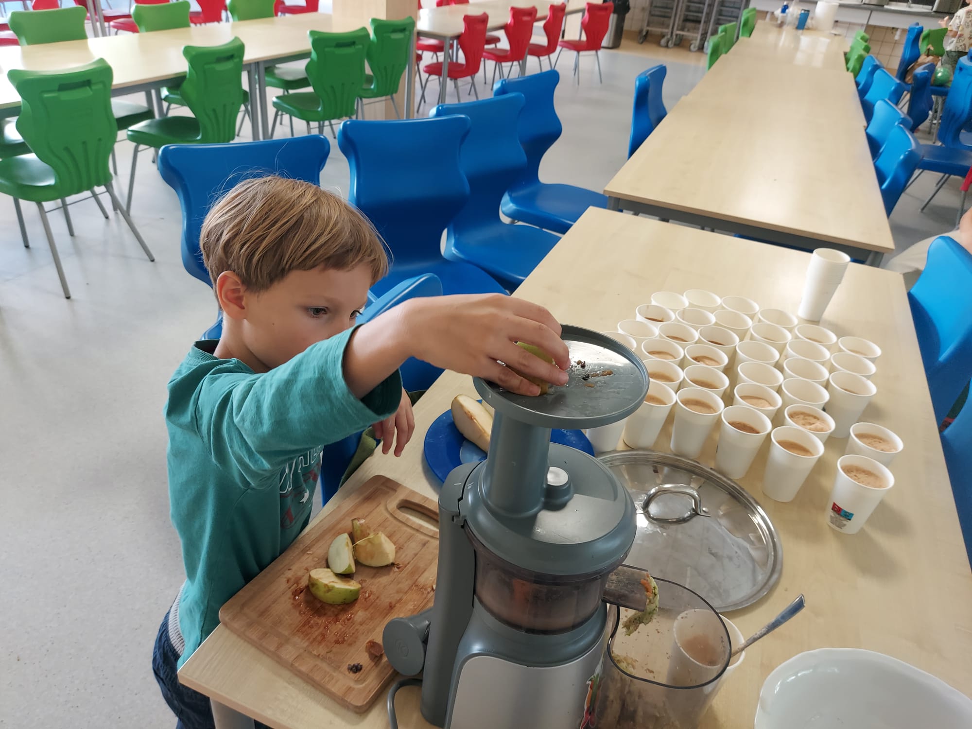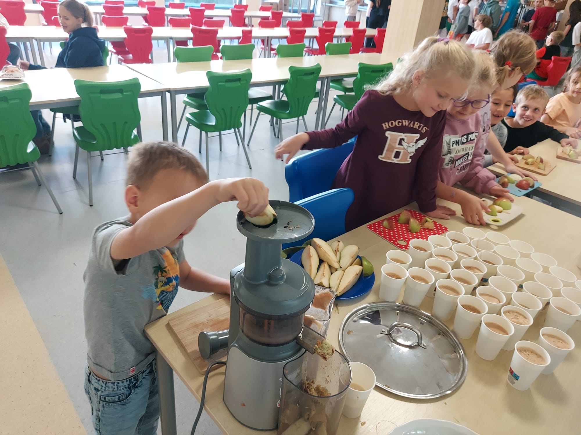 Na powitanie jesieni pierwszaki odkrywają jej smaki! Podczas warsztatów kulinarnych przygotowaliśmy sok z jabłek i gruszek oraz owoce pod owsianą kruszonką.