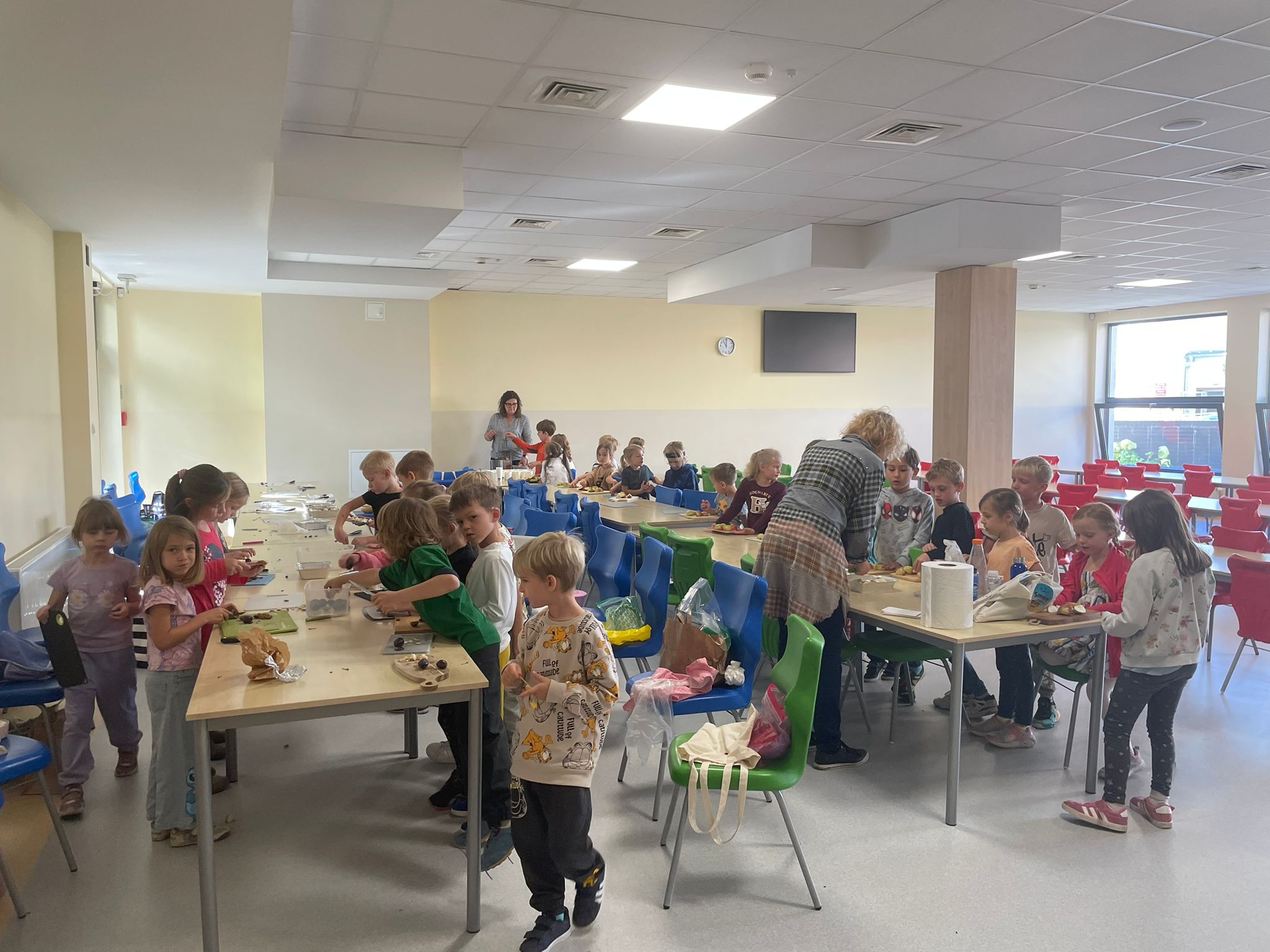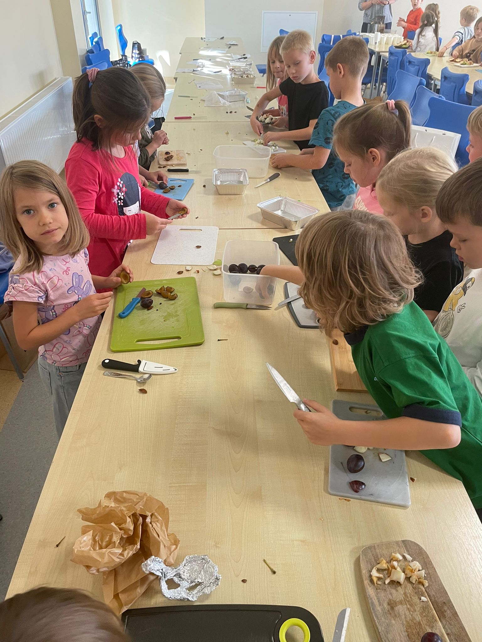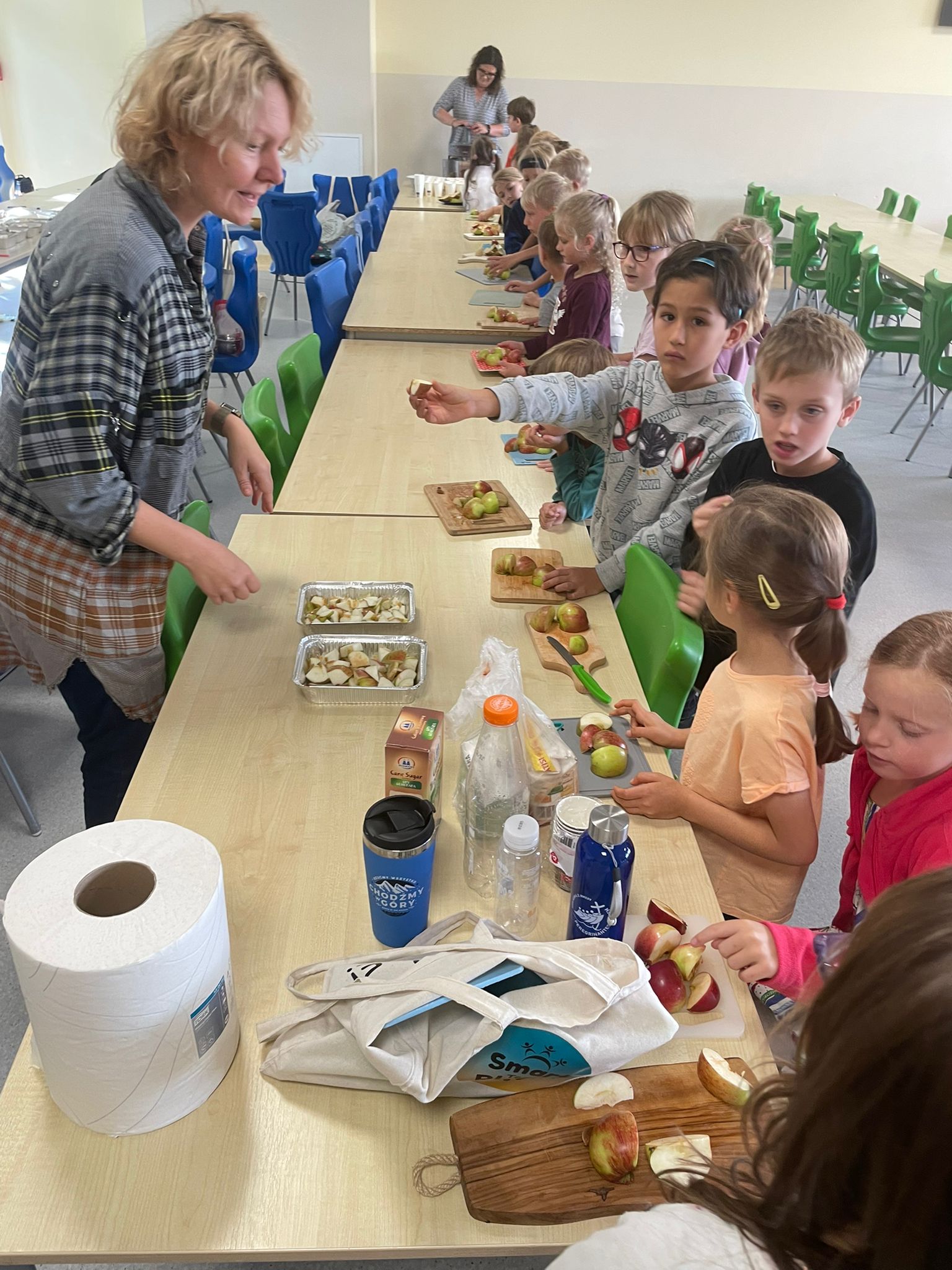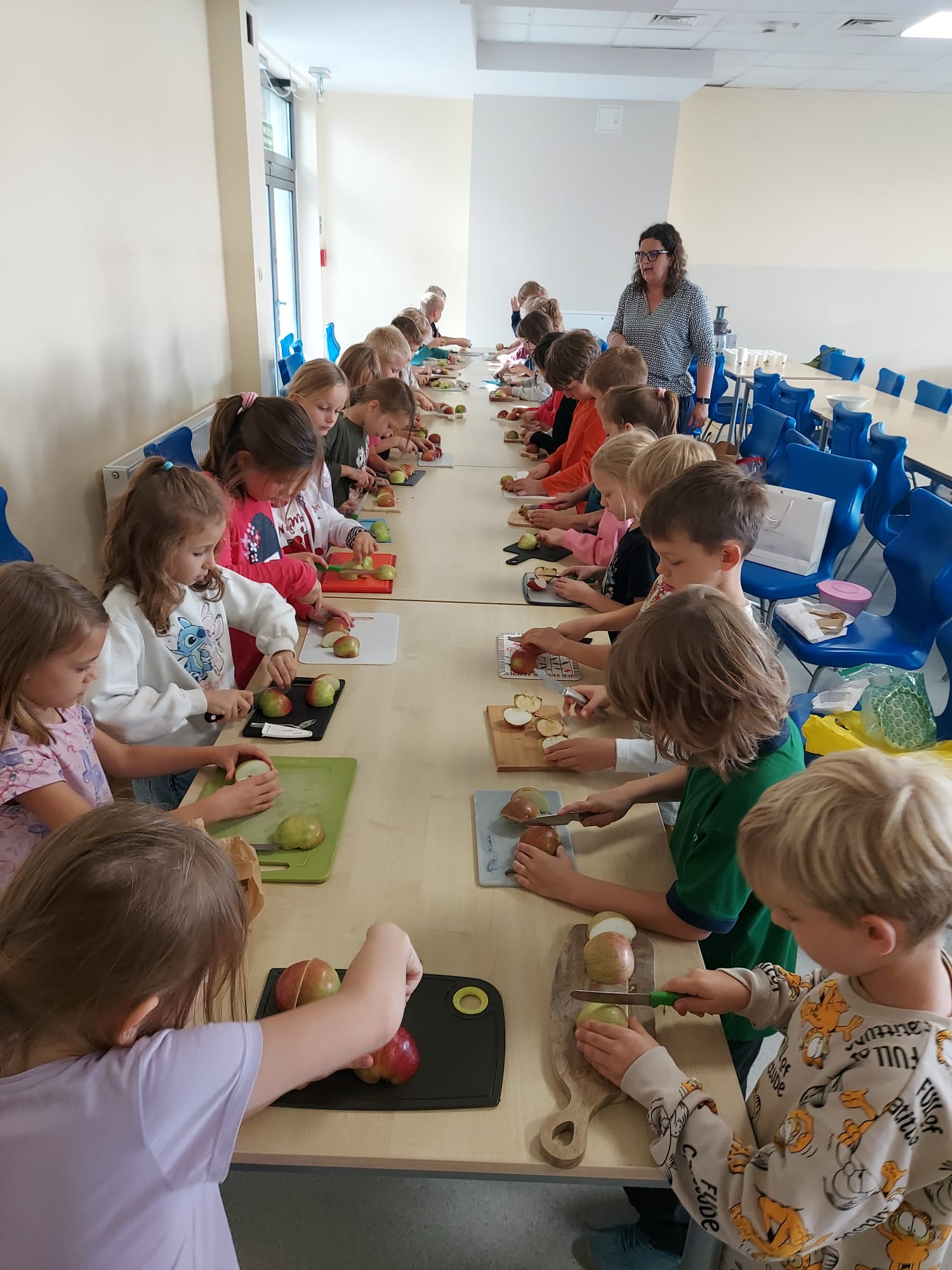 Na powitanie jesieni pierwszaki odkrywają jej smaki! Podczas warsztatów kulinarnych przygotowaliśmy sok z jabłek i gruszek oraz owoce pod owsianą kruszonką.