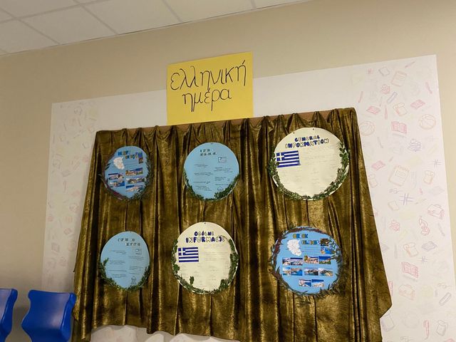 Aby poczuć w szkole choć odrobinę „greckości” ubraliśmy się tego dnia w barwy greckiej flagi – na niebiesko-biało i założyliśmy wieńce laurowe. Przy wejściu do szkoły zawisła grecka flaga. Szkolne korytarze ozdobiliśmy plakatami z informacjami o Grecji. Przedstawiliśmy w ten sposób podstawowe dane na temat geografii, kultury, tradycyjnych potraw i różnych ciekawostek. Zawierały one informacje o kulturze, potrawach i różnych ciekawostkach greckich.